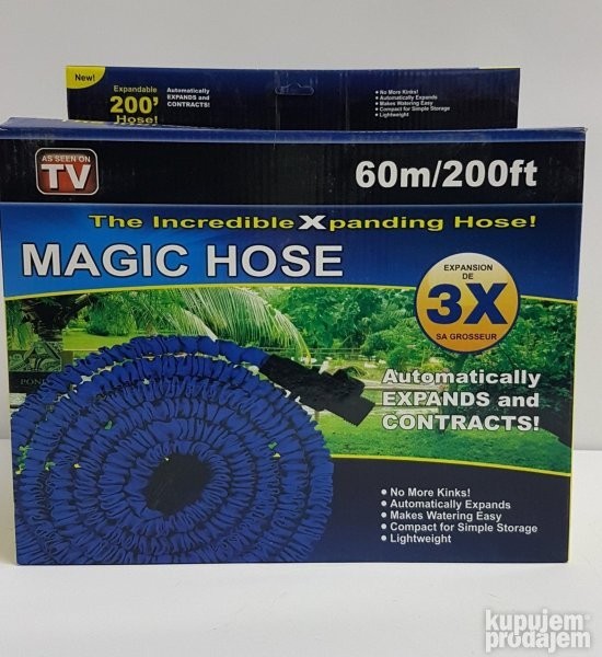 Magicno rastegljivo bastensko crevo za zalivanje, duzine 60m pod pritiskom vode. Kada se voda ispusti iz creva, crevo se automatski skuplja na duzinu od 20m i veoma je lako za skladistenje jer ne zauzima puno prostora. Crevo je napravljeno da ne moze da se lomi i uvija sto ga cini veoma lakim za koriscenje. Takodje, na crevo se moze prikljuciti i prskalica za travu ili se mogu spojiti dva creva. Idealno crevo za vasu bastu, vikendicu, dvoriste, za punjenje bazena, pranje vaseg auta, za zalivanje. . . Kupite X Hose, videcete fenomenalno je! Vazno: nemojte pustati vrelu vodu kroz crevo, nemojte ostavljati ukljucenu vodu i crevo pod pritiskom kada ga ne koristite, nemojte ga ostavljati na jakom suncu i pred zimu izbacite svu vodu iz creva da Vam ne zaledi. Tako ce Vam crevo duze trajati. o, nekorisceno, u originalnom pakovanju
