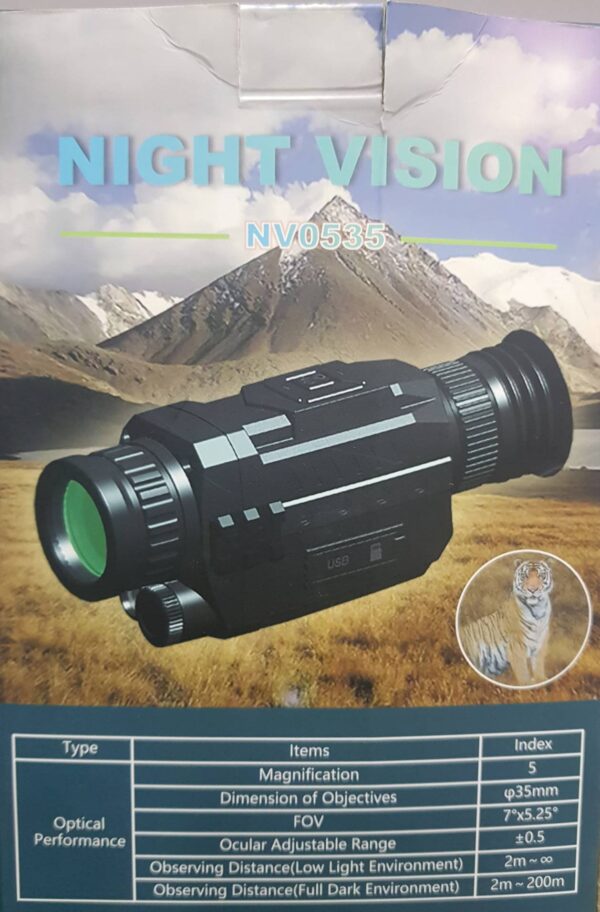 TIN. POPUST NA KOLICINU ! ! ! ! Detalji o proizvodu Marka VOKSOIOZO Tip Monokularni Broj modela NV0535 Uvećavanje Optičko-5k Tip uređaja za noćni vid Monokularni objektiv Prečnik objektiva 35 mm Opseg prilagođavanja objektiva (-0,6) – (+ 0,6 dioptrije) snima fotografije i snima video zapise Funkcija Opseg gledanja 2-200 m Radni napon DC baterija tipa 3.7V Punjiva Li-lon baterija 200k86k56 mm / veličina: približno 7,8k3,3k2,2 inča Pogled na anđeo 7 ° k5,25 ° !